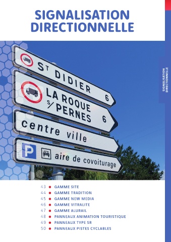 SIGNALISATION DIRECTIONNELLE SIGNALISATION DIRECTIONNELLE 43 GAMME SITE 44 GAMME TRADITION 45 GAMME NEW MEDIA 46 GAMME VITRALITE 47 GAMME ALURAIL 48 PANNEAUX ANIMATION TOURISTIQUE 49 PANNEAUX TYPE SR 50 PANNEAUX PISTES CYCLABLES